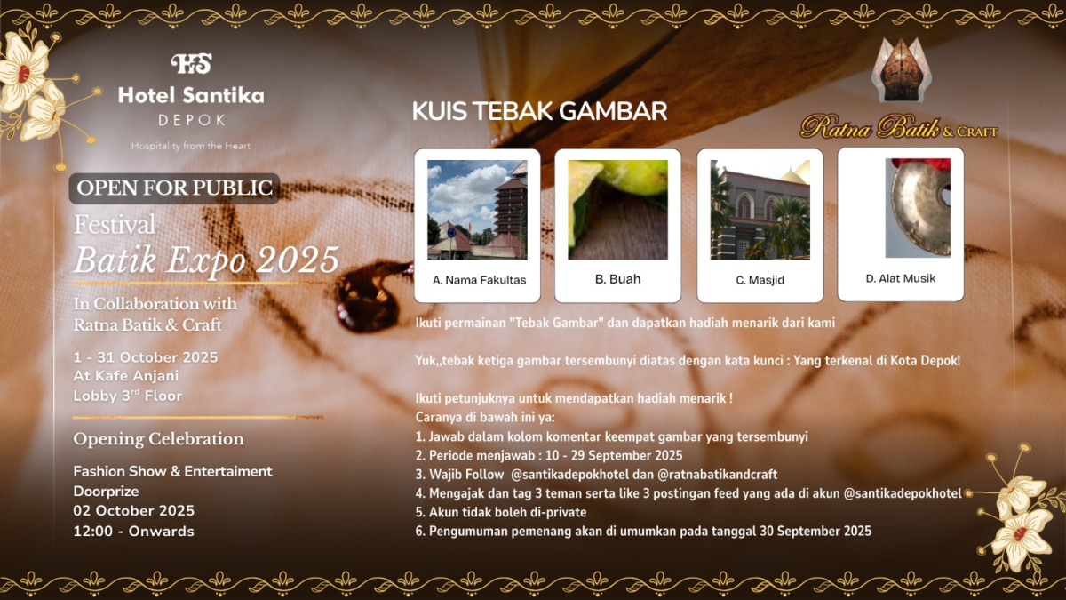 “Yang membuat menarik Festival Batik tahun ini adalah kami menyiapkan hadiah Voucher Menginap di unit Santika & Santika Premiere Jabodetabek serta Bandung dan yang terbaru Hotel Santika Premiere Hills Resorts Cibadak untuk 3 pemenang Kuis di Instagram, 3 pemenang undian Doorprize bagi pengunjung Kafe Anjani yang melakukan transaksi pembelian Buffet Batik selama Oktober 2025 dan 3 pemenang undian Doorprize saat acara puncak untuk pembelian Buffet saat acara pembukaan berlangsung.”tambah Riri S Setiowati selaku PR sekaligus GM Secretary Hotel Santika Depok.