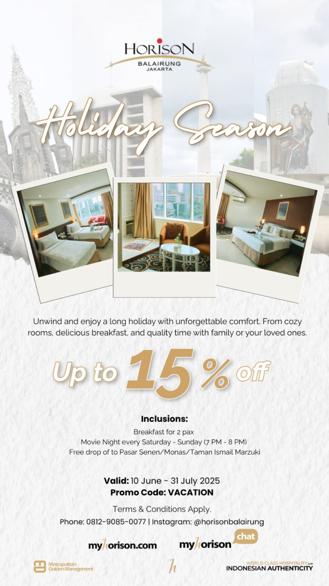 Menyambut liburan panjang pertengahan tahun, Horison Balairung Jakarta menghadirkan program promosi spesial bertajuk “Holiday Season Promo”, yang memberikan potongan harga hingga 15% bagi para tamu yang melakukan pemesanan melalui situs resmi www.myhorison.com. Promo ini berlaku untuk periode menginap mulai dari 10 Juni hingga 31 Juli 2025.
