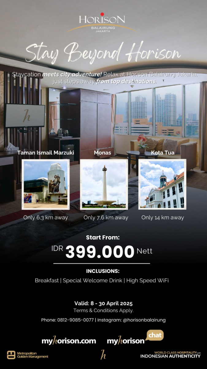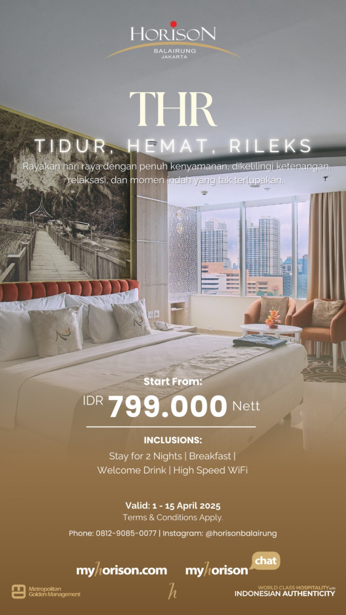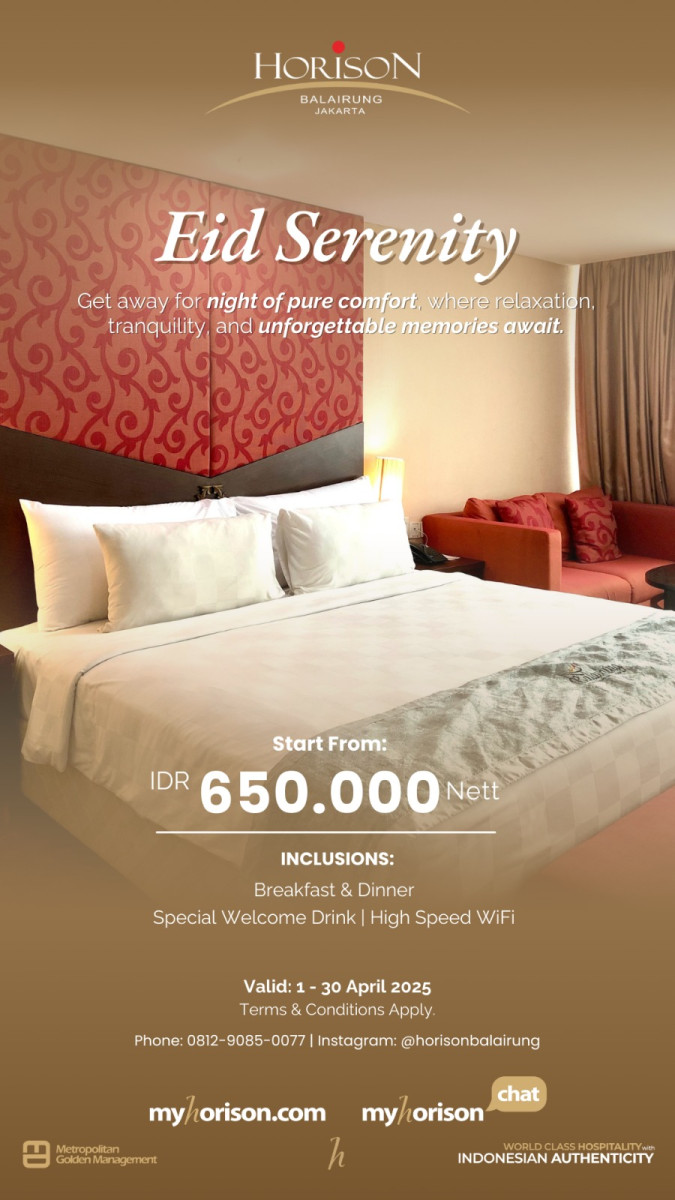 Horison Balairung Jakarta mempersembahkan deretan promo kamar eksklusif sepanjang bulan April 2025. Dalam suasana Ramadan yang penuh makna dan menyambut hari raya Idulfitri, hotel yang berada di bawah naungan Metropolitan Golden Management ini menghadirkan tiga paket istimewa: Stay Beyond Horison, Eid Serenity, dan THR (Tidur, Hemat, Rileks).