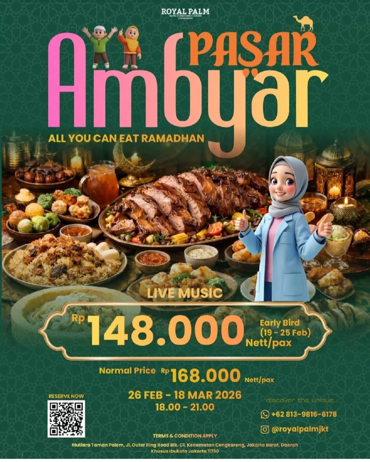 Untuk informasi lebih lanjut dan reservasi Pasar Ambyar 2026, tamu dapat menghubungi +62 813-9816-6178, +62 838-9909-0088 atau mengunjungi akun Instagram resmi @royalpalmjkt.