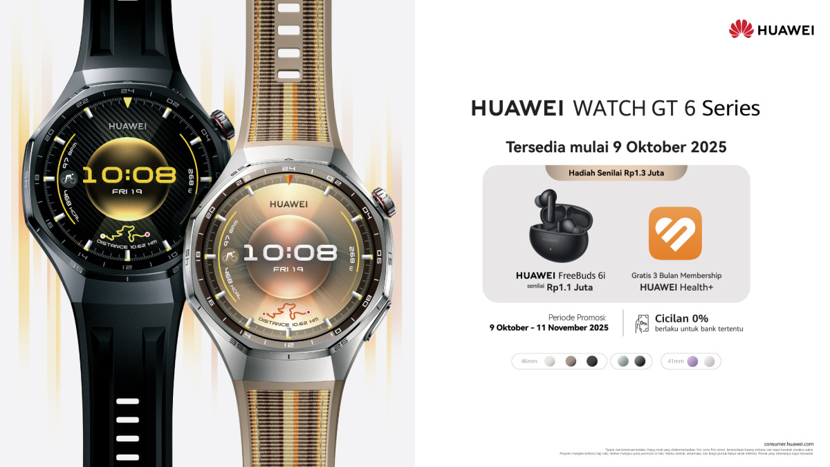 Huawei siap menghadirkan HUAWEI WATCH GT 6 Series di seluruh kanal penjualan resmi Indonesia mulai 9 Oktober 2025. Selama periode launching yang berlangsung hingga 11 November 2025, konsumen dapat menikmati promo bundling eksklusif senilai Rp1,3 juta berupa HUAWEI FreeBuds 6i dan langganan HUAWEI Health+ tiga bulan.