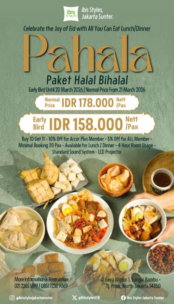 Dalam rangka menyambut momen Hari Raya Idul Fitri dan tradisi Halal Bihalal, ibis Styles Jakarta Sunter menghadirkan penawaran spesial bertajuk “Pahala – Paket Halal Bihalal”, sebuah paket makan siang atau makan malam buffet sepuasnya yang dirancang untuk mempererat kebersa bersama keluarga, rekan kerja, maupun teman-teman.