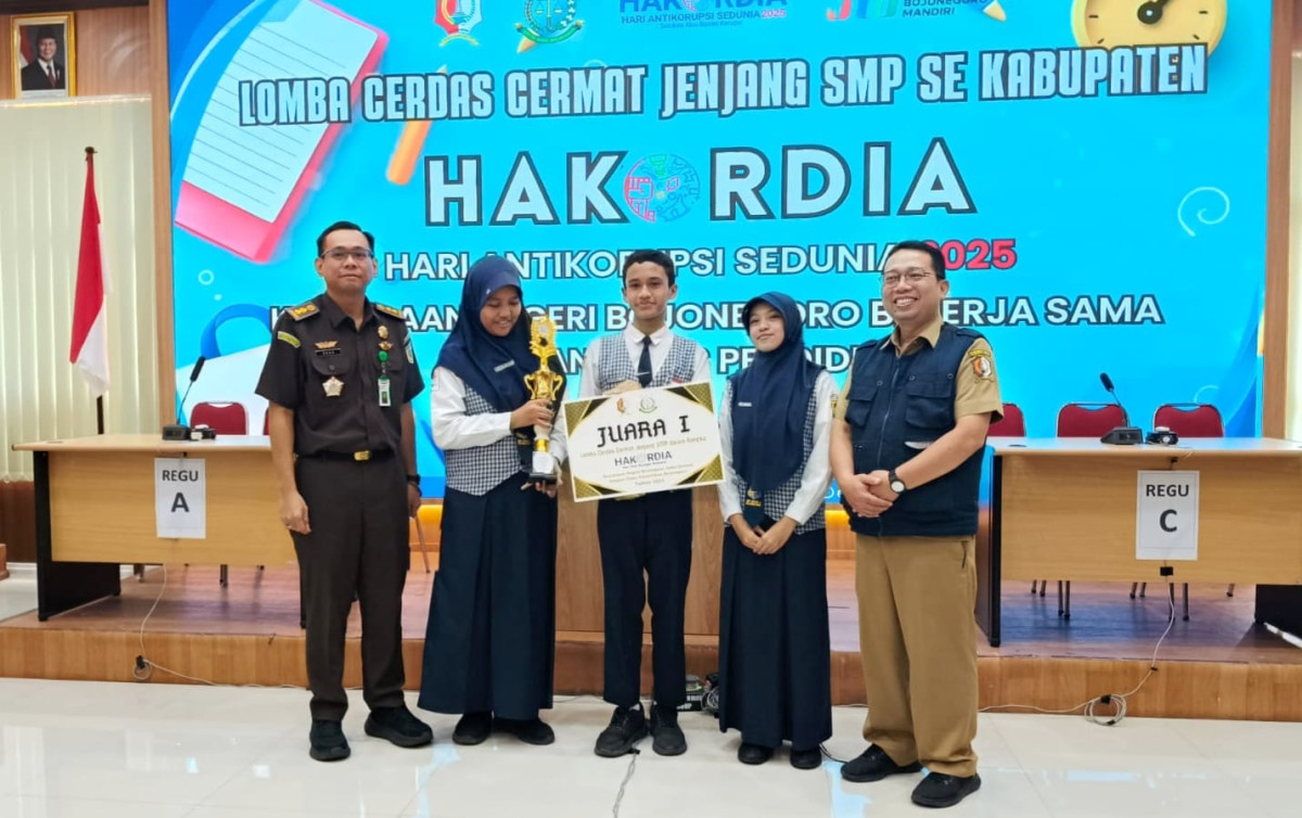 Wartajakarta.com-Dalam rangka memperingati Hari Antikorupsi Sedunia (Hakordia) Tahun 2025, Kejaksaan Negeri Bojonegoro bekerjasama dengan Dinas Pendidikan, menggelar lomba cerdas cermat berteman anti korupsi tingkat SMP se-Kabupaten Bojonegoro. Terdapat 57 tim yang mewakili sekolahnya masing-masing dalam kegiatan ini, salah satunya adalah tim dari SMPN 2 Bojonegoro. 1 tim SPENDABO terdiri dari 3 anggota, yakni Nabilla Yafathussyarfa, Muhammad Nuh dan Reysia Natasya Putri.