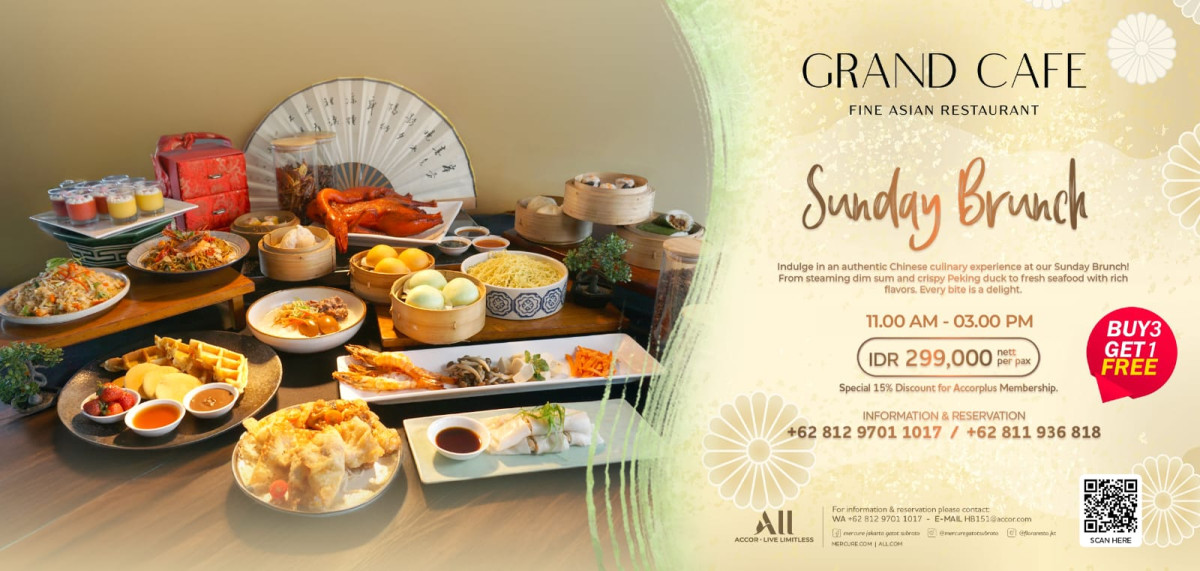 Mengusung kualitas premium, Sunday Brunch ini menghadirkan beragam pilihan menu seperti aneka dimsum, bebek peking panggang, dan lamian segar yang diolah dari bahan-bahan terbaik. Konsep buffet yang elegan dan suasana yang nyaman menjadikan Grand Café pilihan tepat untuk bersantap bersama keluarga maupun rekan.